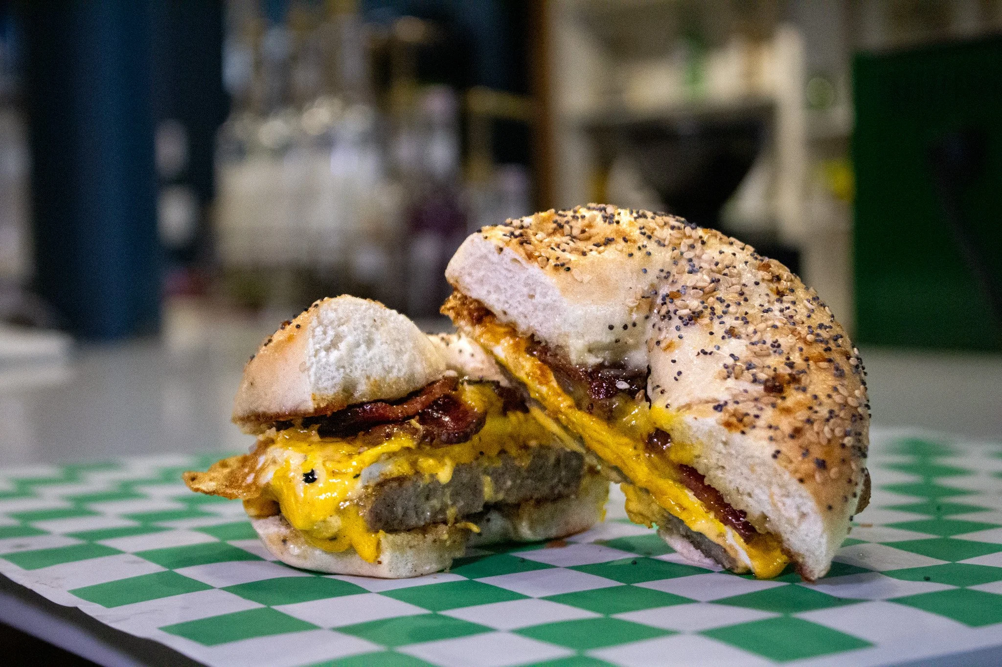 Everything Bagel, Sausage, Bacon, Egg, American Cheese, Garlic Aioli