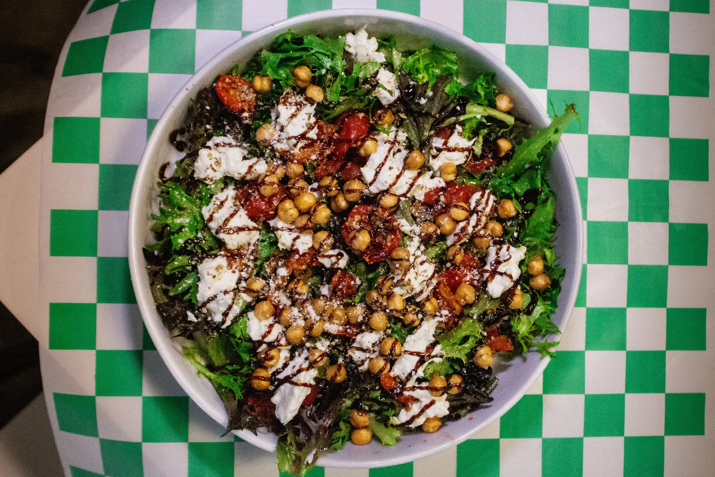 mixed greens, roasted tomatoes, burrata cheese, balsamic glaze, toasted chickpeas, house-made basil pesto dressing