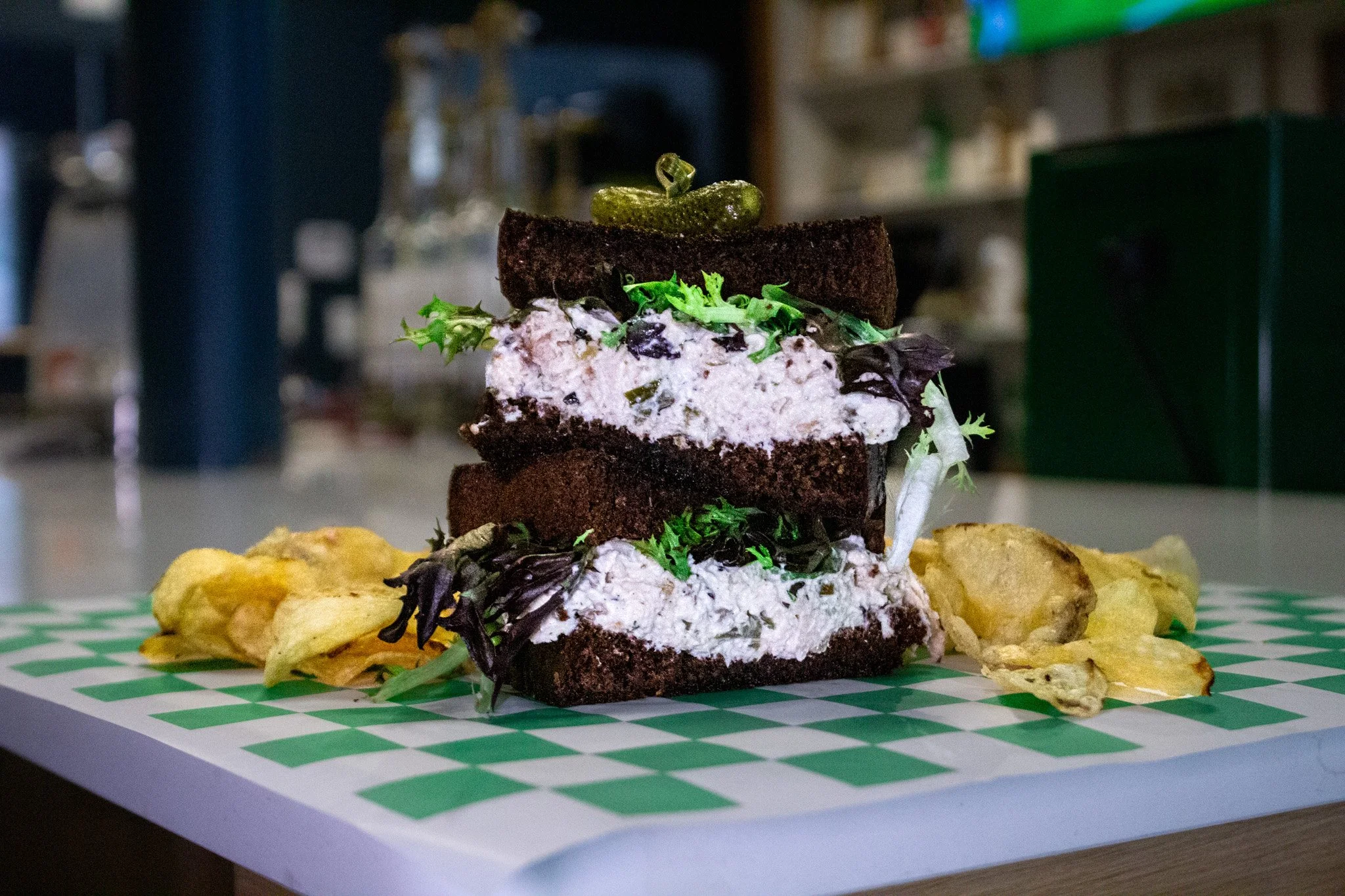 rustic white or black rye, mixed greens, house-made chicken salad (NO nuts, no fruit, no weird stuff)